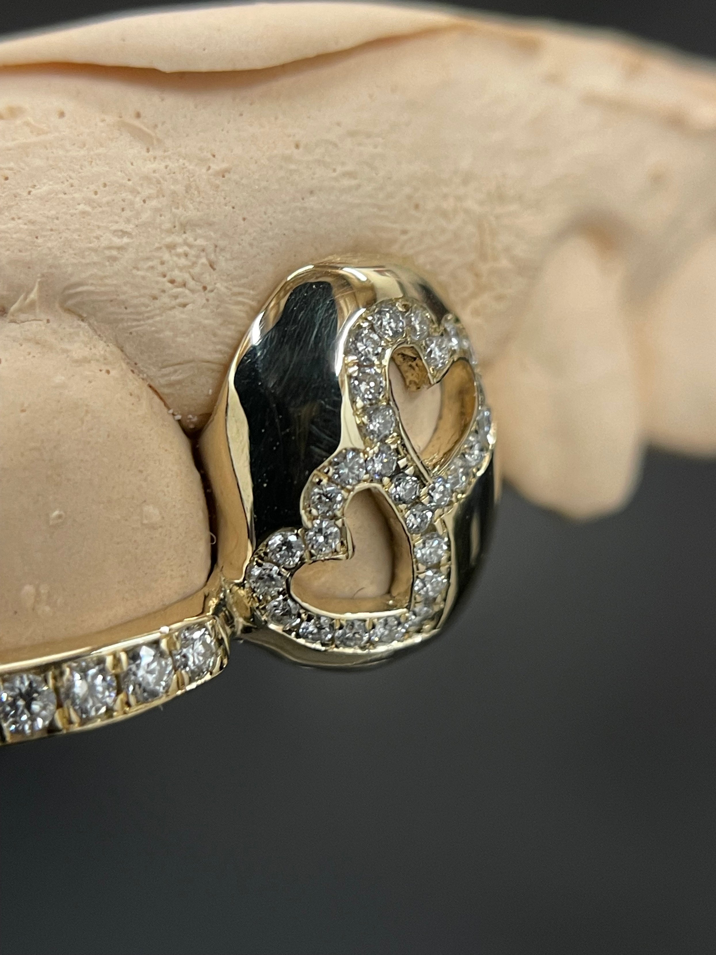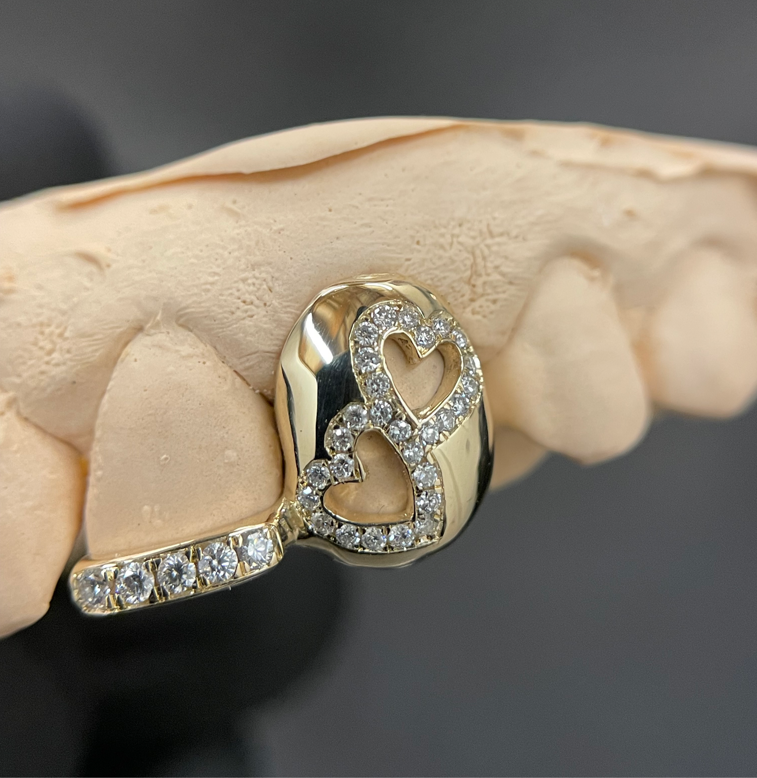 Tiny hand cut hearts encased with micro set vvs diamonds.