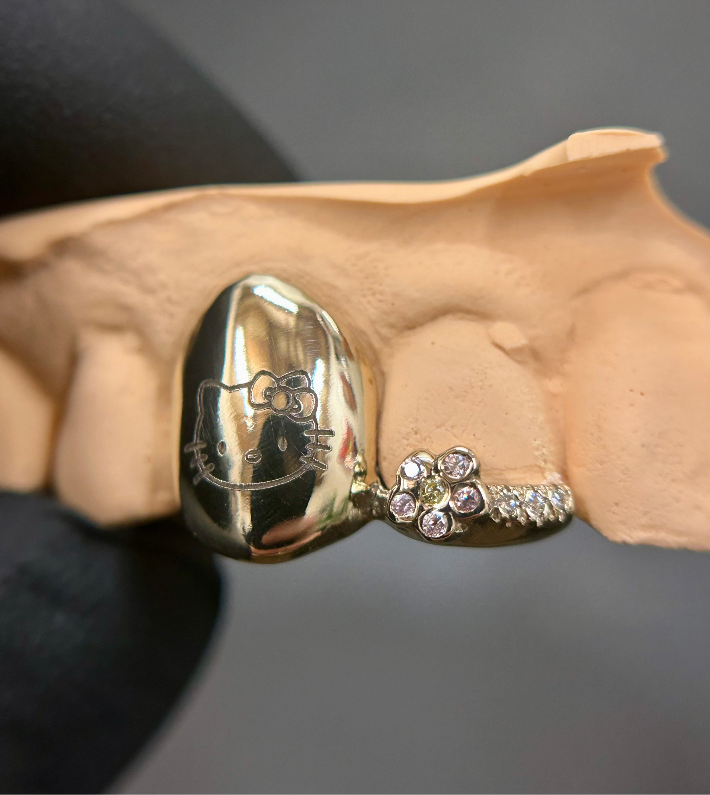 Engraved Hello Kitty and Sapphire flower and Moissanite inlay design. The engraving can be customised, allowing you to swap the design for a personalised creation.